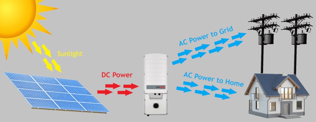 Solar panels convert the light from the sun into DC power, which then needs to be converted into AC power for your home to use. This is where Inverters come in.  They take that freshly harnessed DC power and convert it into usable energy that gets fed back to the grid AND powers your home.